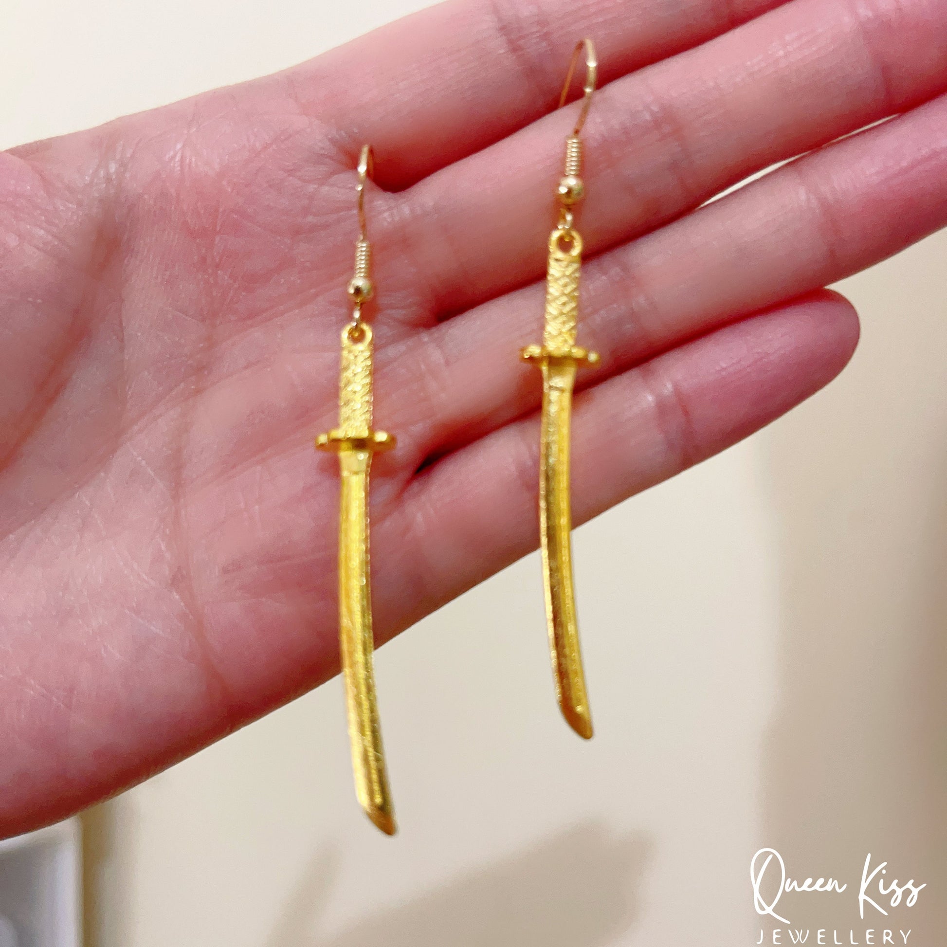 Sword and Knight Antique Gold Earrings Dagger Medieval Weapon Geek Drop Dangle Gothic Grunge Claymore Earrings-- Glory and Love!!